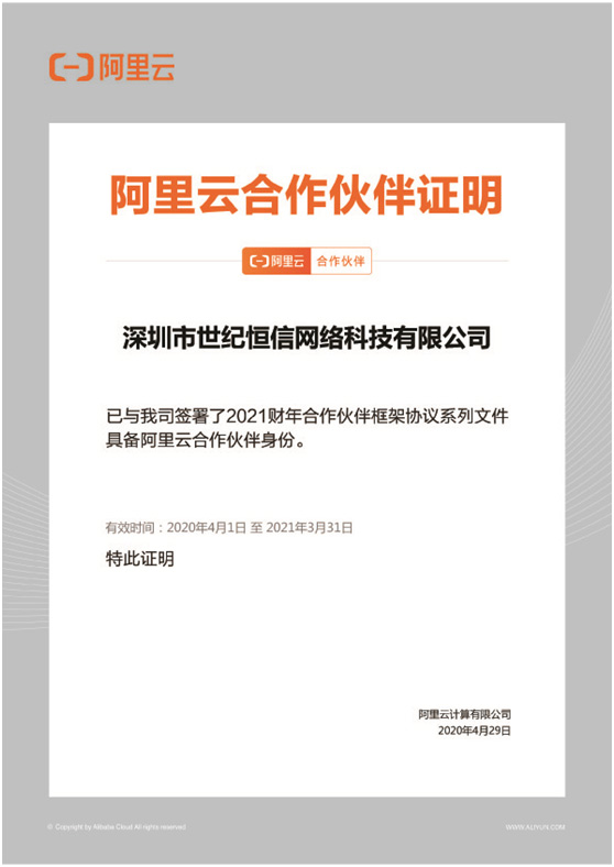 阿裡(lǐ)雲合作(zuò)夥伴證明(míng)